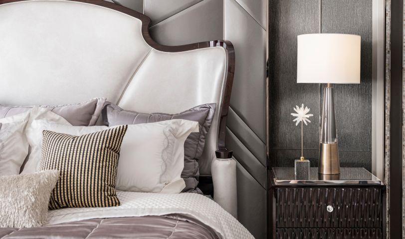 主臥視覺上選擇更為低調(diào)雅致的色彩,湖水藍色絲絨沙發(fā)質(zhì)感上乘,造型優(yōu)雅而復古,清雅細膩的布藝和點睛的水晶裝飾透露出主人的時尚品味。