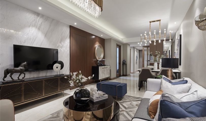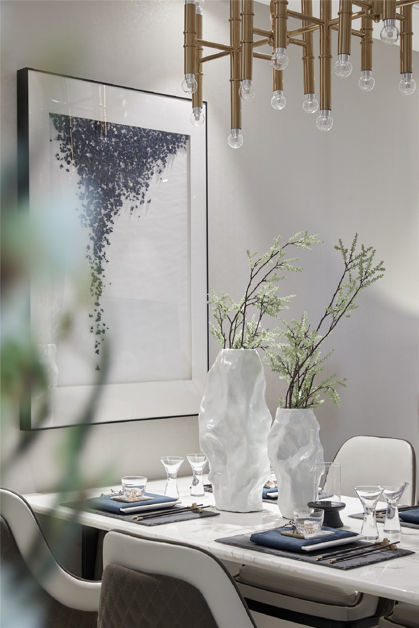 空間布局上從入門處一覽無遺,客餐廳保持空間連貫性,主臥隱于收藏柜后側(cè),保留空間私密性的同時又不至于過分獨立分隔。
