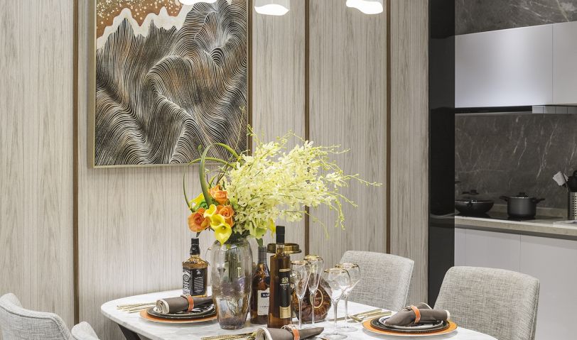 布藝與皮革在別致燈具的襯托下,與云石臺面相映相稱,有如藝術(shù)品般,點(diǎn)綴空間的浪漫香氛,給予了空間更多的想象藝術(shù)。一種簡約低調(diào)的奢華、一種高級雅正的美悄然降臨期間。