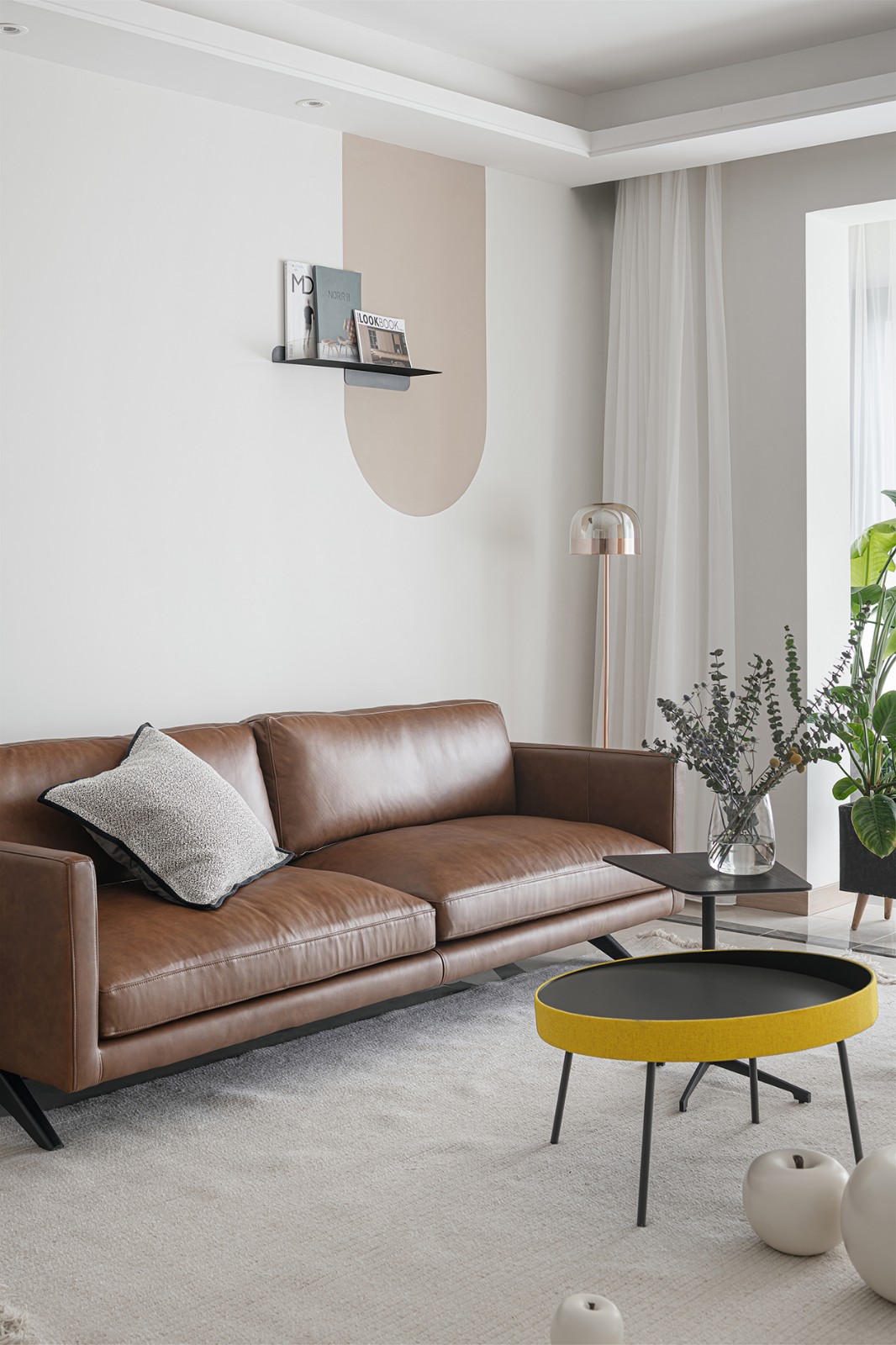 客廳——焦糖色NORHOR沙發(fā)奠定了客廳自然溫暖的基調(diào),背景墻上暖咖色的弧形圖案與裝飾臺(tái)讓原本的白色墻面顯得不再無(wú)聊單一,與線條簡(jiǎn)潔的落地?zé)?、幾案搭配,相得益彰,?gòu)成了一幅純粹而富有質(zhì)感的畫(huà)面。