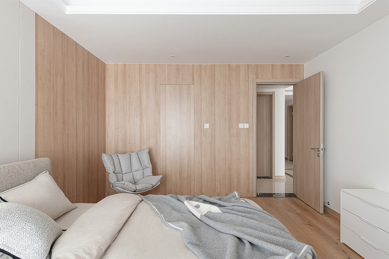 臥室地板和部分墻面采用天然樸實(shí)的木質(zhì)材料,營(yíng)造出柔和靜謐的休憩氛圍,與公共空間的原木風(fēng)格相呼應(yīng)。