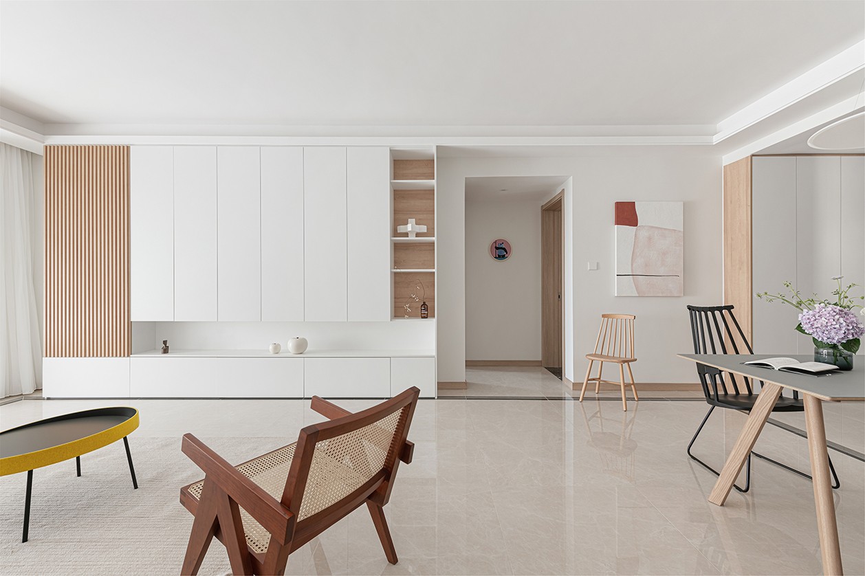 溫潤(rùn)的原木色分散在空間里,氤氳出純樸素雅的居家氣質(zhì),而高飽和度的黃色圓桌、粉色熊貓裝飾畫(huà)為室內(nèi)帶來(lái)一絲活潑的氣息,中和了木質(zhì)的清雅。業(yè)主一家喜愛(ài)讀書(shū),所以客廳打破常規(guī),用大面積儲(chǔ)物柜代替了電視,滿足了客戶的書(shū)籍收納需求。