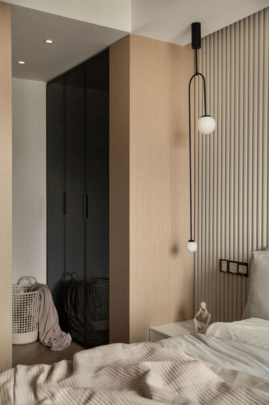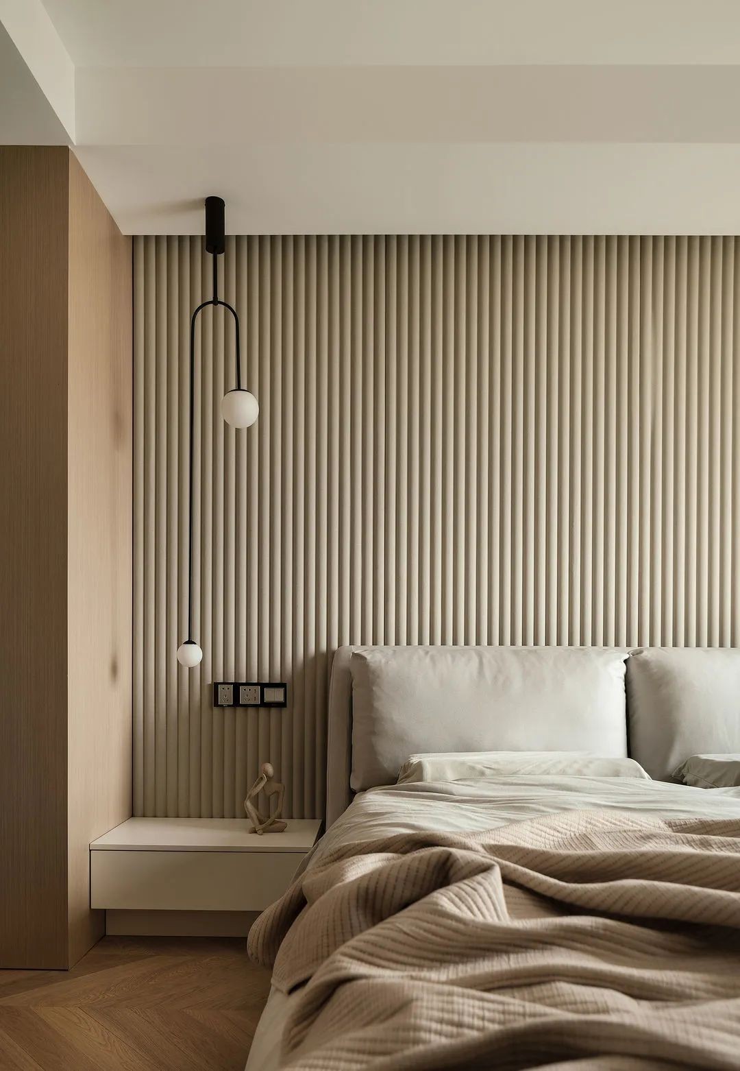 主臥背景采用的是墻布包波浪板結(jié)合木飾面的設(shè)計。