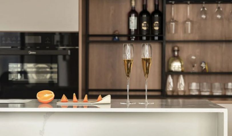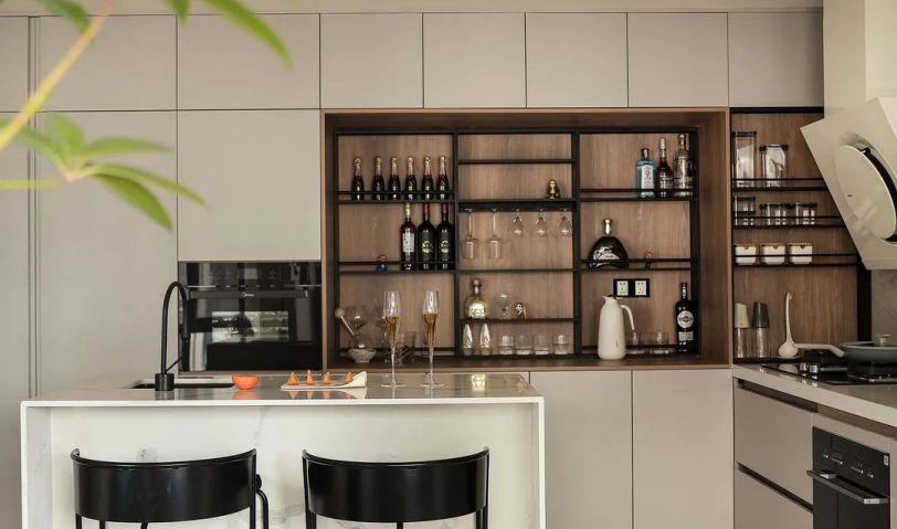 中西廚結(jié)合開放式空間,冰箱暗藏,整排的酒柜