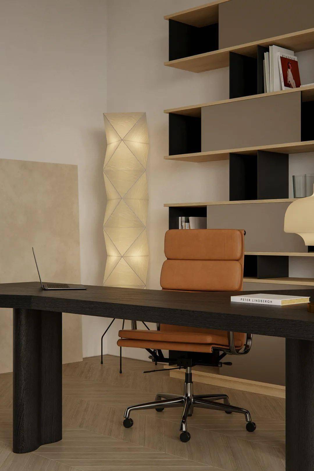 黑色的書(shū)桌搭配橘色的真皮沙發(fā)靠椅