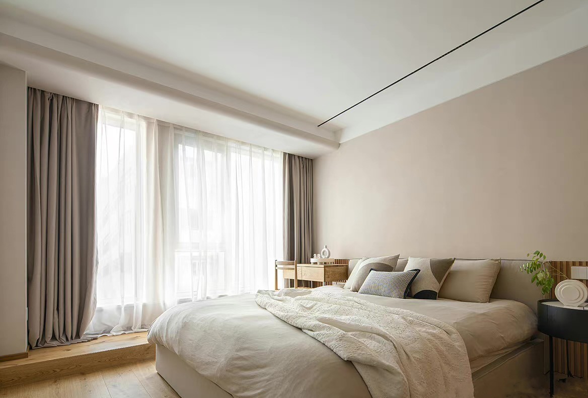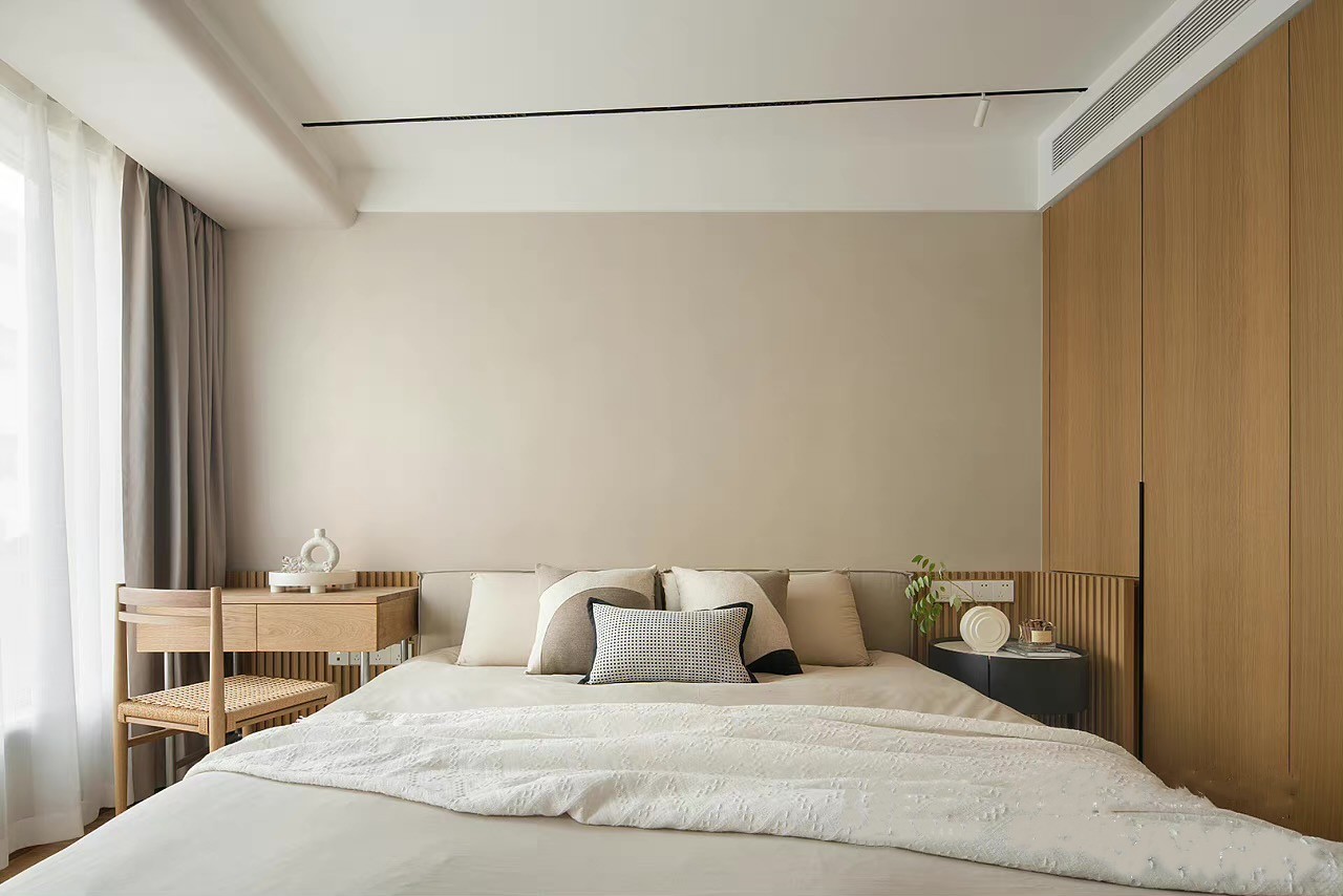 主臥延續(xù)了原木與白的搭配,淺色系的軟裝,營造出既溫馨又質(zhì)樸的私人空間。