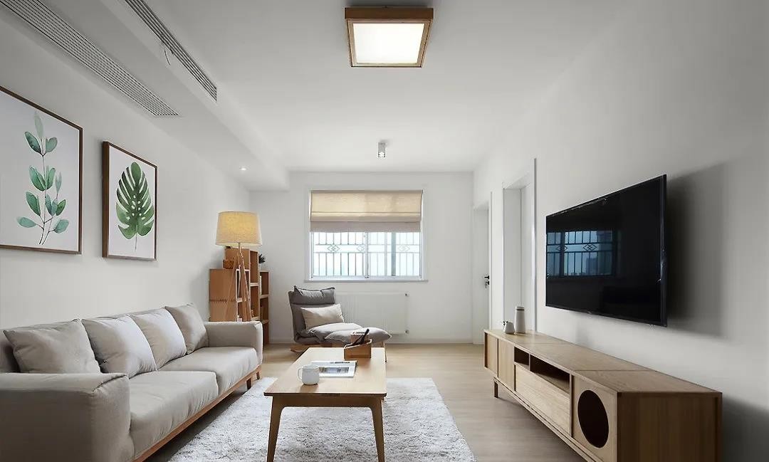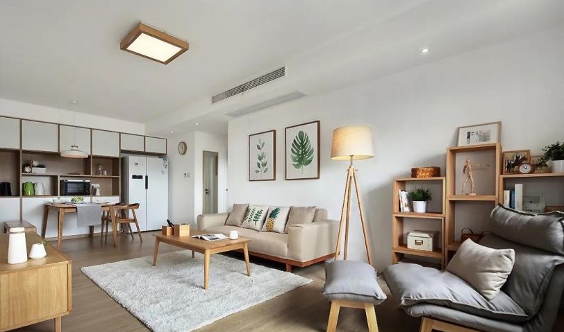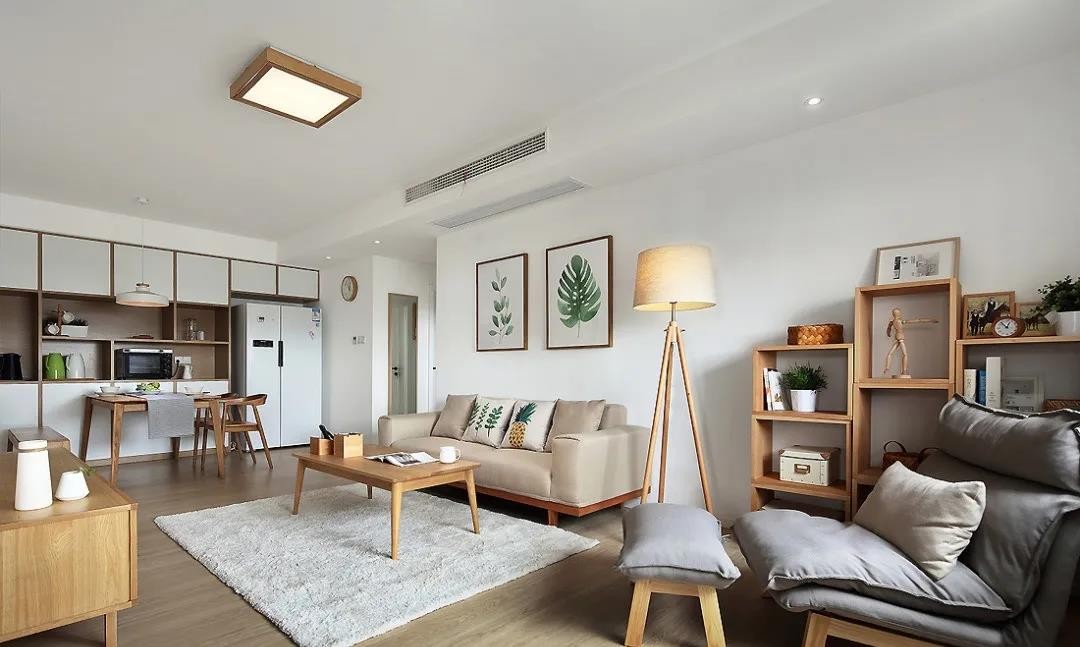 客廳區(qū)域整體的硬裝設(shè)計(jì),主要是以白色為主色調(diào),家具主要以原木的為主。