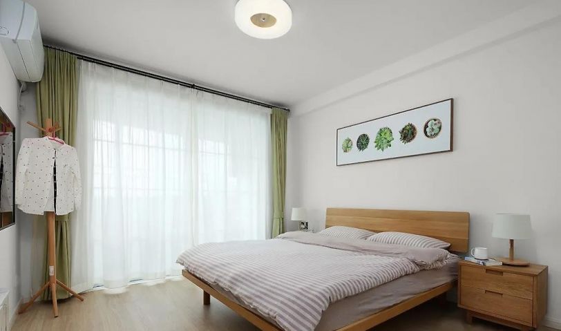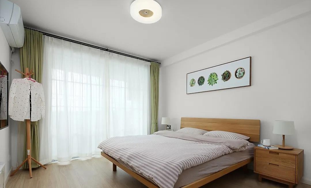 主臥采用大面積的原木色,床、床邊柜,條紋的床單與自然清新的掛畫綠植相結(jié)合。