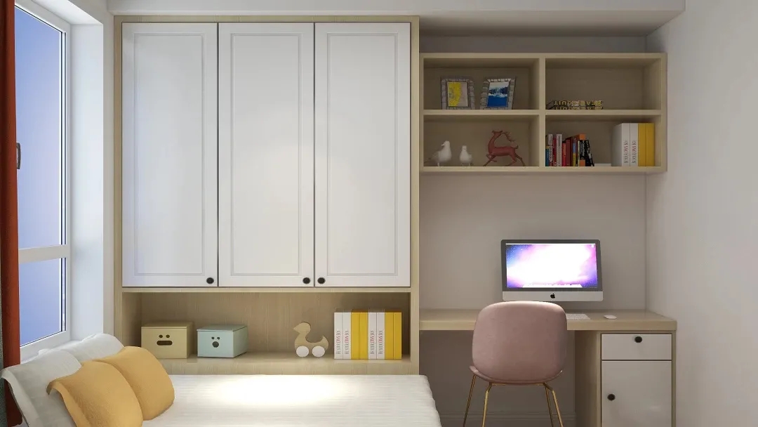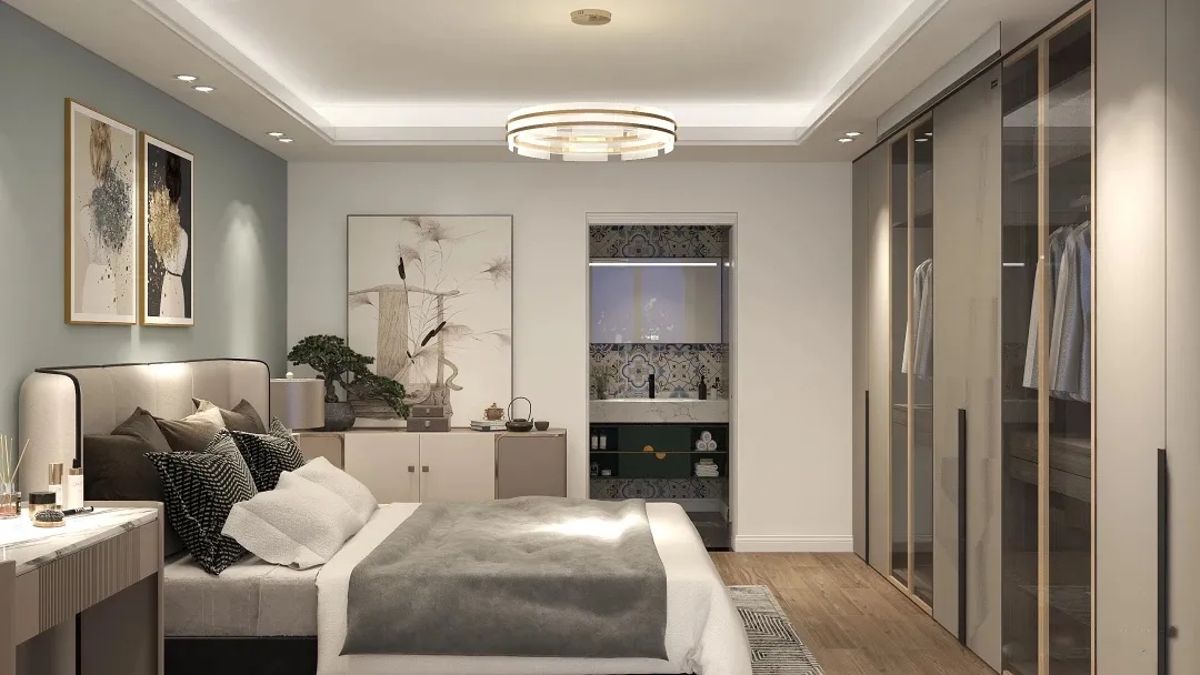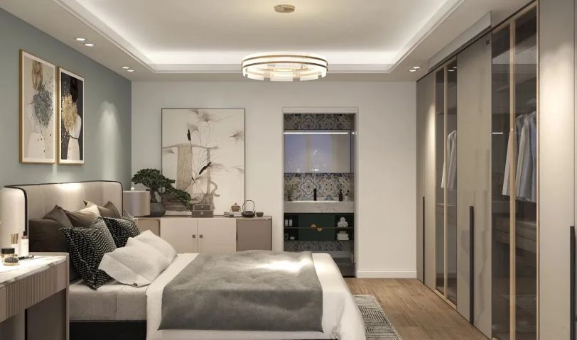 頂面吊頂豐富了空間的層次感,視覺上主次分明,住多久都不會產(chǎn)生視覺疲勞。臥室淺灰色壁紙,打造整排頂天立地的衣柜,收納功能十分強(qiáng)大