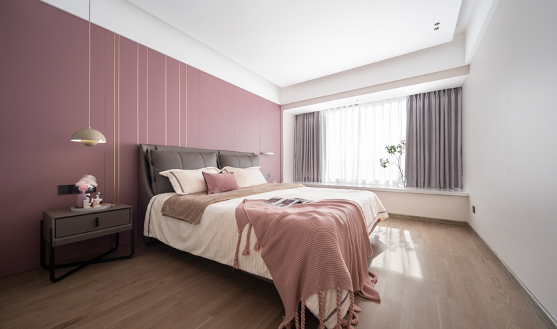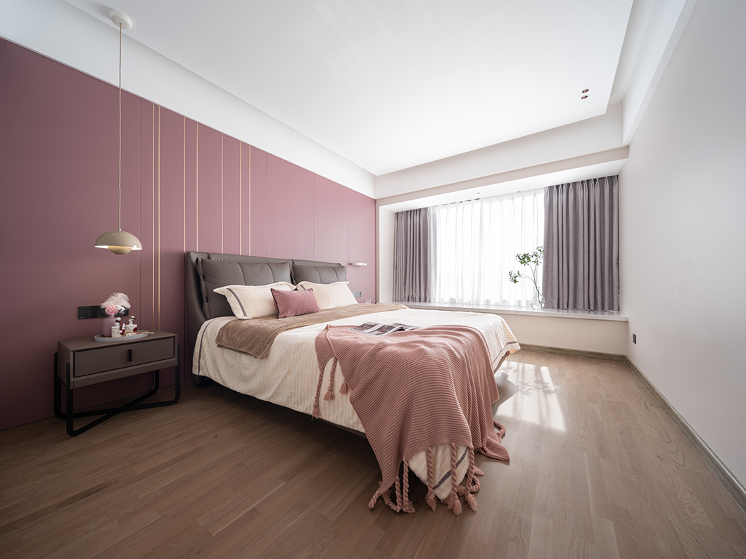 粉紅色的床頭墻、編織線毯,色系溫柔且強大