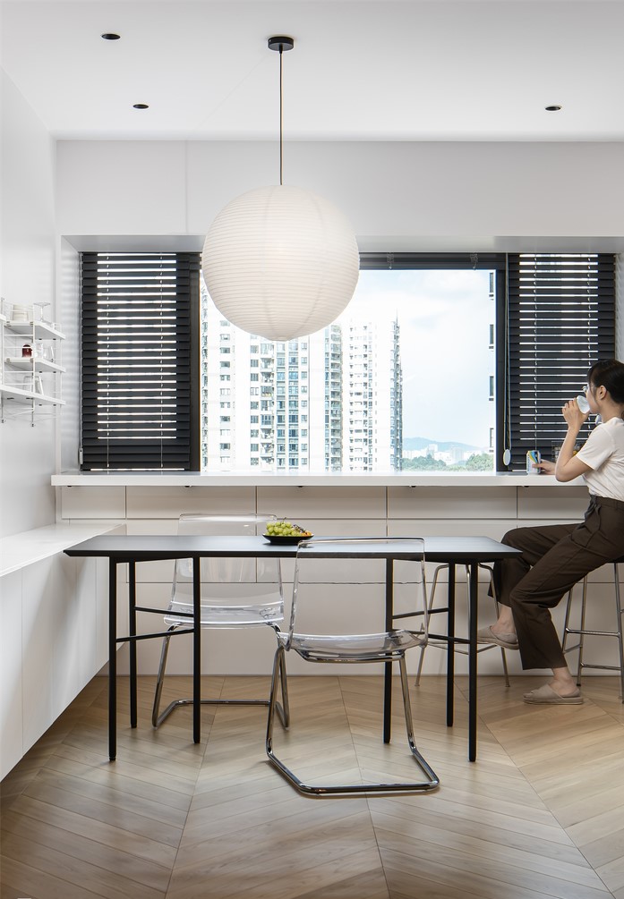 為了不使餐廳的飄窗閑置,設(shè)計(jì)師直接在原精裝房飄窗上加裝了儲(chǔ)物抽屜兼吧臺(tái)。