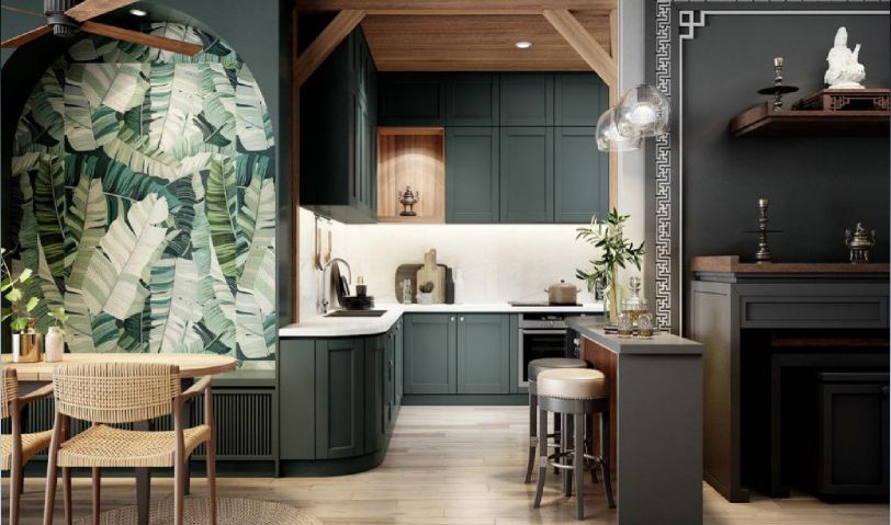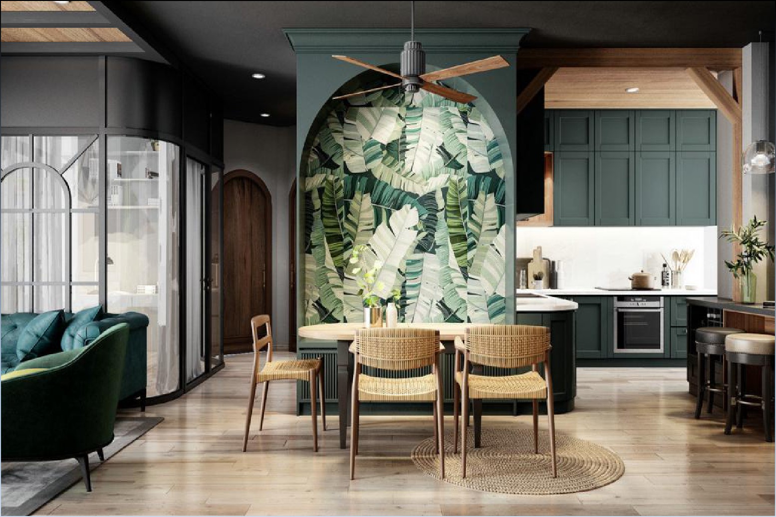 卡座與餐桌的結合,功能齊全,方便至極!在風格上,這里延續(xù)客廳餐廳的裝飾,墨綠色的柜體搭配原木色的餐桌餐椅,木色地板極富質感也有著天然的紋理,餐桌上方的吊扇燈飾更為這一空間增添了時尚感,整個空間毫不繁瑣,卻自有簡潔特有的美感。