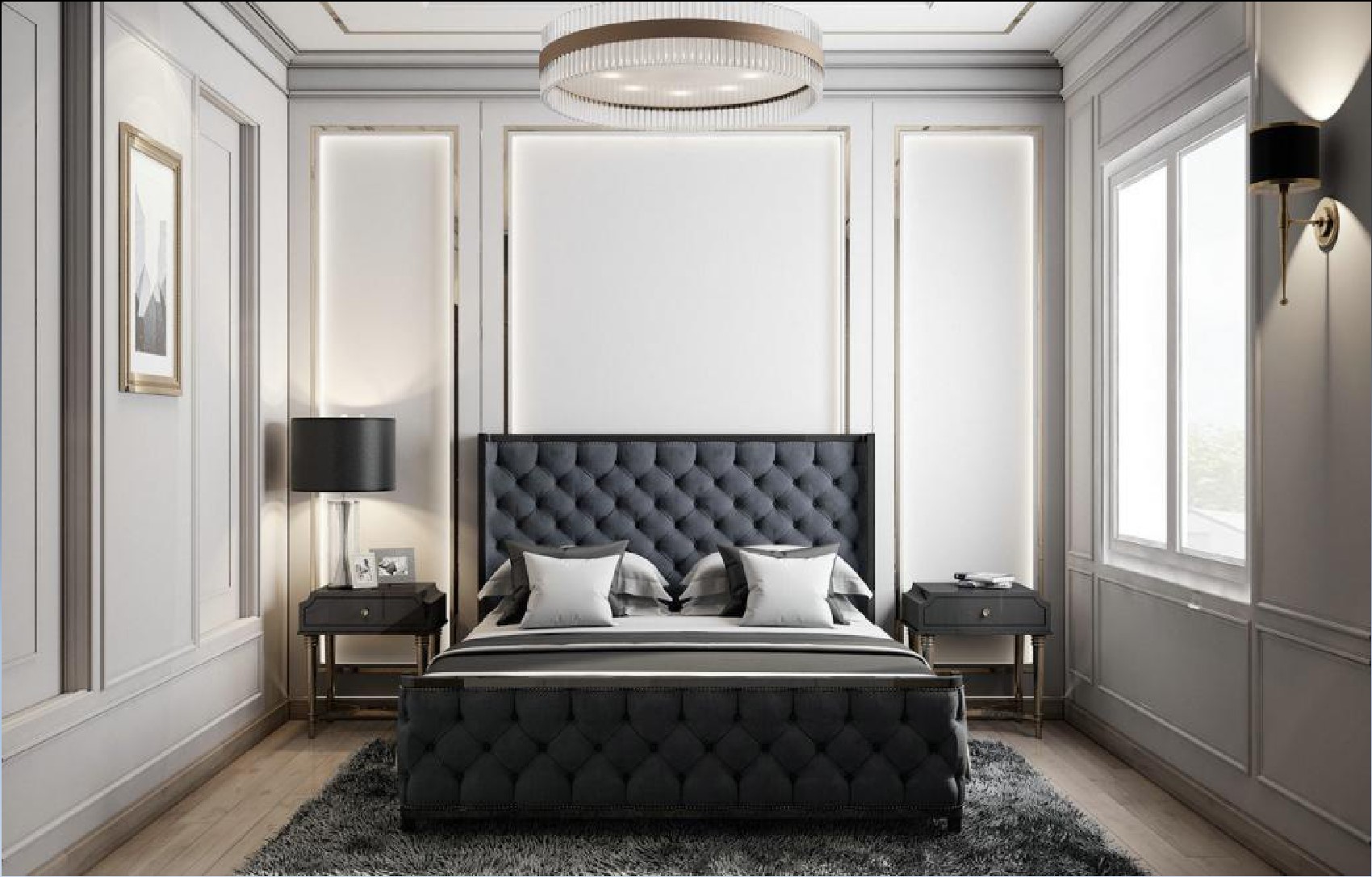 臥室的顏色冷暖結合,床頭背景墻簡單的造型搭配金屬收邊條,光澤感像絲綢一樣的床品和窗簾,一冷一暖,搭配床頭點光源,陳設的魅力如此簡單、直白。裝飾品的色彩和造型打破了空間的規(guī)律性,表達空間的豐富性和層次感。