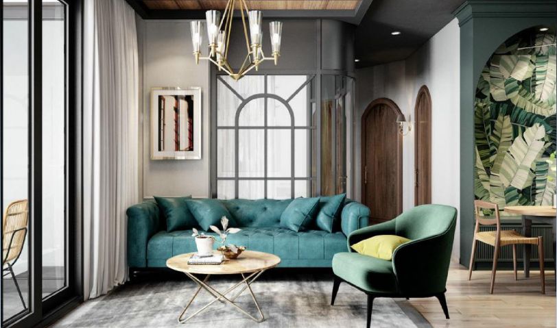 在客廳色調的選擇上,以高貴的墨綠色為主。運用黃色的抱枕作為跳色,通過原木色地板搭配灰色地毯與藝術品的懸掛和燈光的使用,營造空間的時尚感。