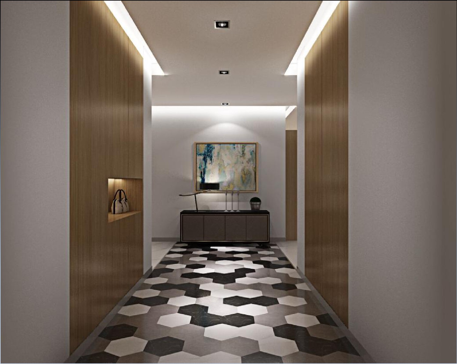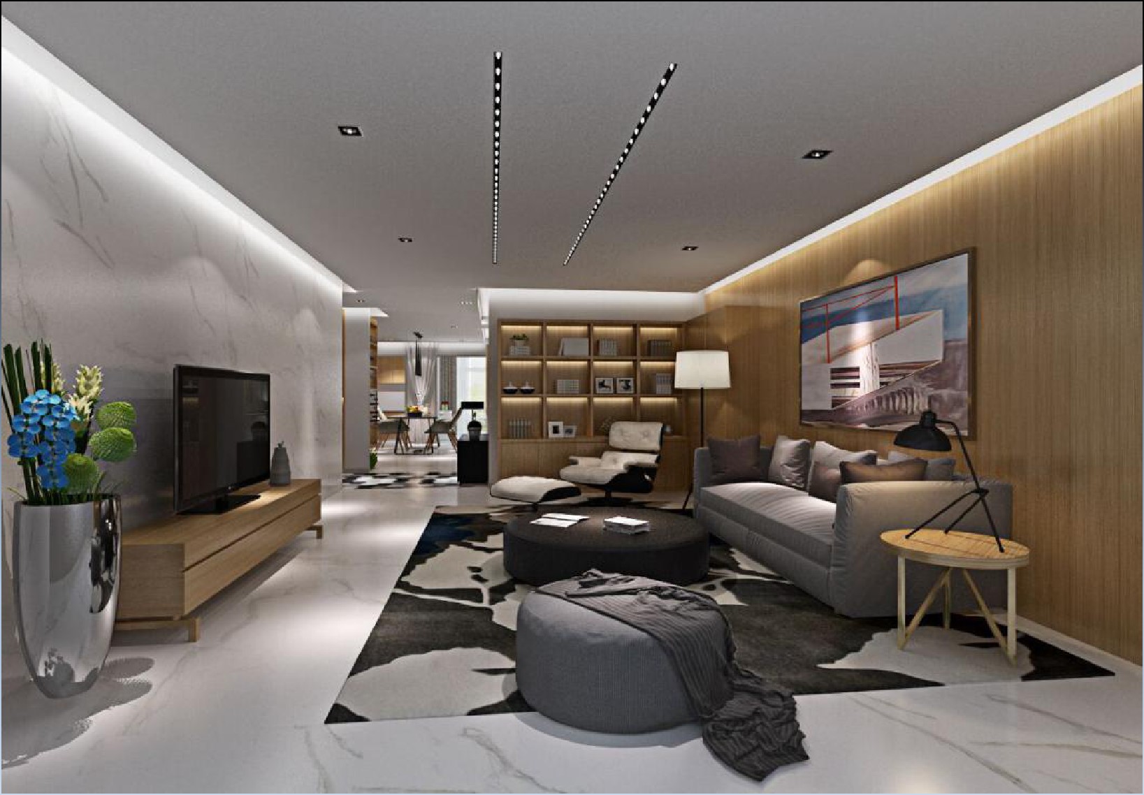 在客廳色調(diào)的選擇上,以淡雅的暖色調(diào)為主。運(yùn)用原木色的材質(zhì)作為沙發(fā)背景墻,通過(guò)大理石電視背景墻與藝術(shù)品的懸掛和燈光的使用,營(yíng)造空間的時(shí)尚感。