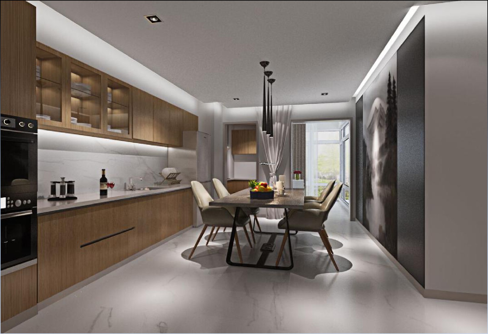 餐廳:西廚與餐廳的結(jié)合,功能齊全,方便至極!在風(fēng)格上,這里延續(xù)客廳餐廳的裝飾,淺原木色的柜體搭配亮白色瓷磚,大理石的臺(tái)面極富質(zhì)感,地面也有著天然的紋理,餐桌上方的燈飾更為這一空間增添了時(shí)尚感,整個(gè)空間毫不繁瑣,卻自有簡(jiǎn)潔特有的美感。