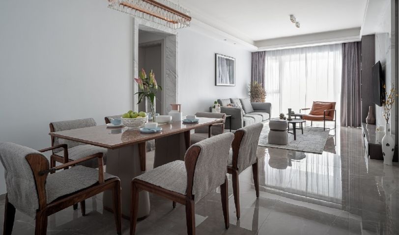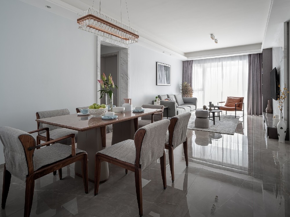 椅子的靠墊選擇了柔和的帶點(diǎn)暖灰色的布藝搭配胡桃木餐桌,營造溫馨德就餐環(huán)境。