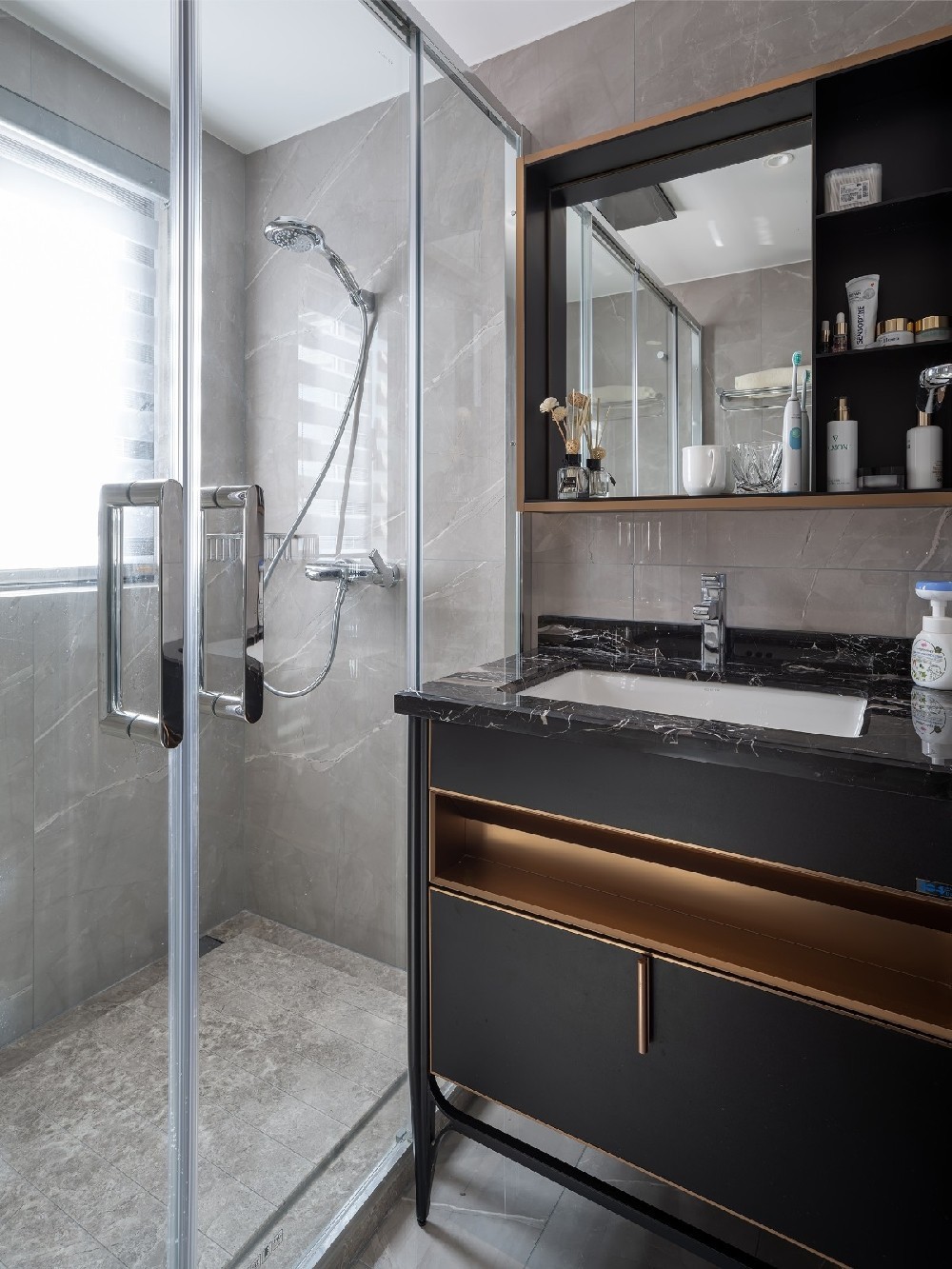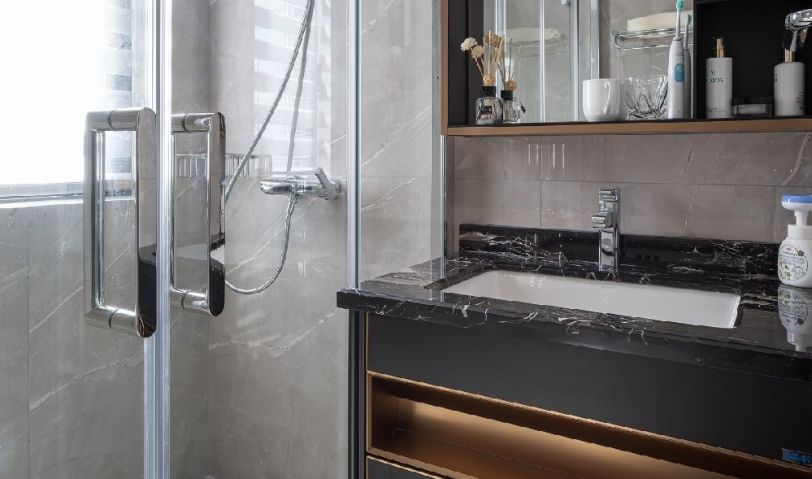 主衛(wèi)的鏡柜為女主人留足了每天精心打扮的空間,收納空間也足夠使用。大理石和金色元素的碰撞相得益彰。