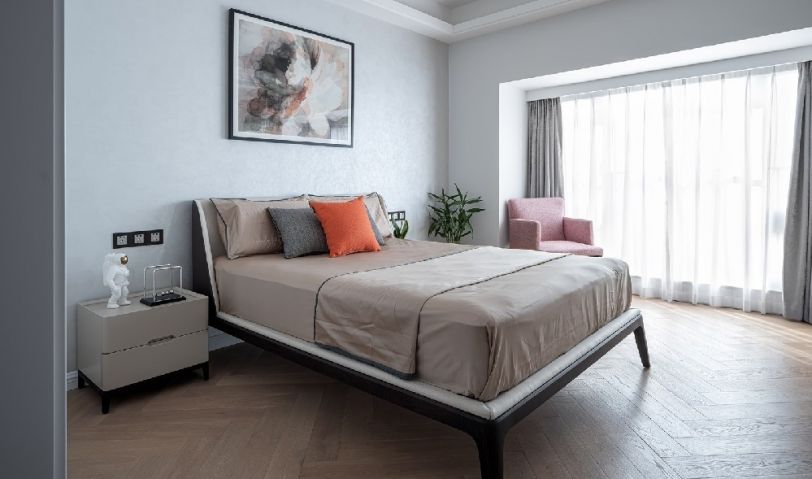 暖系地板做鋪墊,冷色系墻面做撞色,凸顯了層次感,床頭背景藝術(shù)漆做了處理,使空間變得律動了起來。