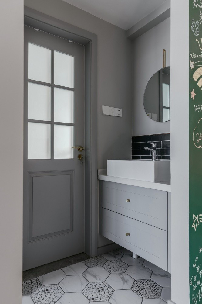 衛(wèi)生間干區(qū)以灰色為主調(diào),墻面局部鋪貼黑色瓷磚,防水的同時(shí)也讓視覺層次更加豐富。
