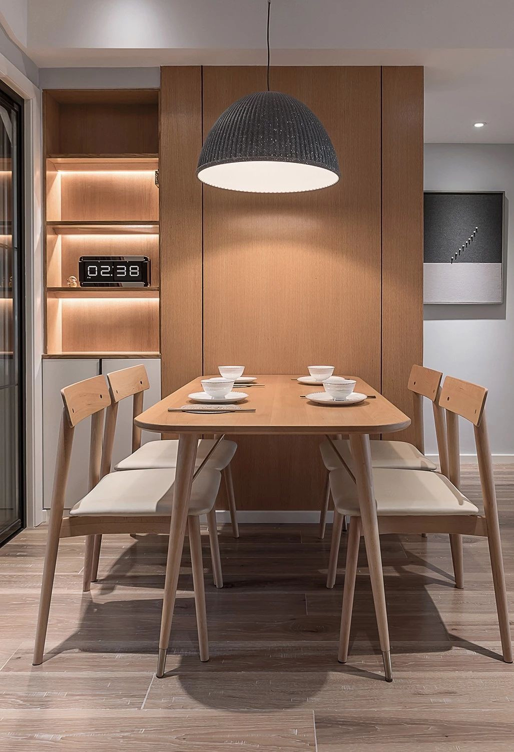 入墻設(shè)計(jì)的餐邊柜收納與展示功能兼?zhèn)洌故靖裰羞€做了藏光設(shè)計(jì),營(yíng)造溫馨舒適的用餐氛圍。