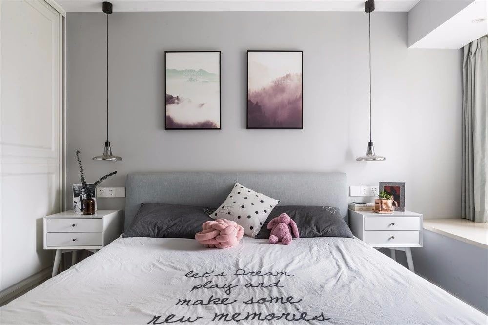 對稱的主臥布局,灰色床頭背景墻掛了飄渺的云霧裝飾畫,結(jié)合床頭兩盞簡約精致的吊燈,讓主臥也充滿了令人沉醉的浪漫情調(diào)。