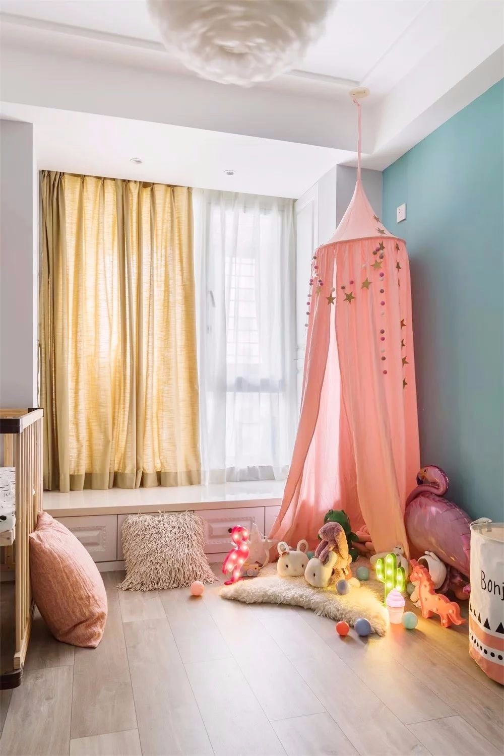 一張木質(zhì)嬰兒床,一個掛有姜黃色窗簾的飄窗區(qū),一個娛樂區(qū),一席地毯+粉色床幔,加上天花一盞羽毛燈,充滿了暖暖的溫情。