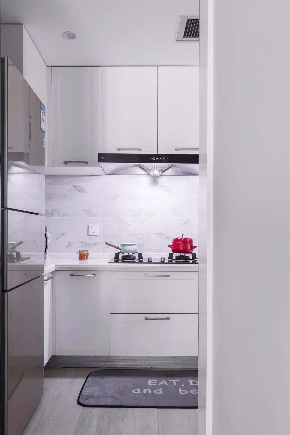 白色為主色調(diào)的廚房,墻面貼了白色紋理磚,結(jié)合白色櫥柜的布置,也營造了開闊輕松的視覺氛圍。