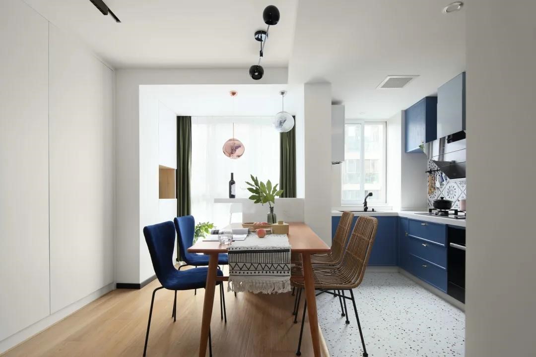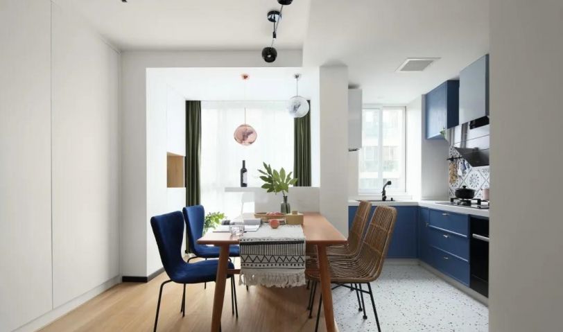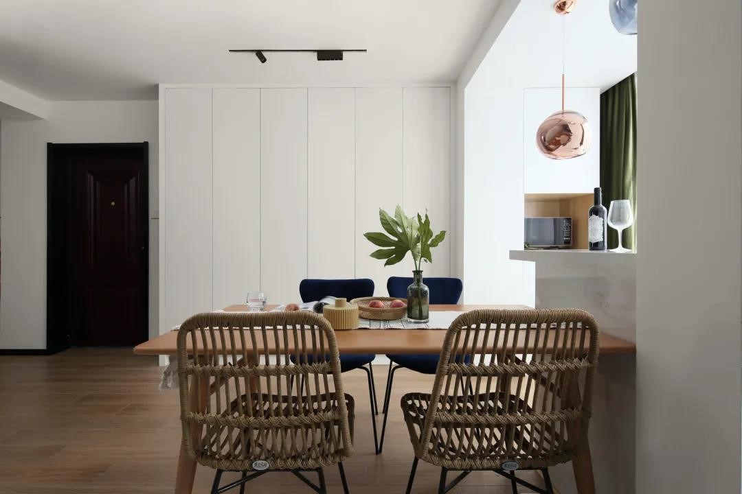 餐廳簡(jiǎn)潔大方的空間,與廚房做成開放式的格局設(shè)計(jì),布置木質(zhì)餐桌,還有藤椅+布藝結(jié)合的餐椅,整體空間感顯得小資舒適而情趣