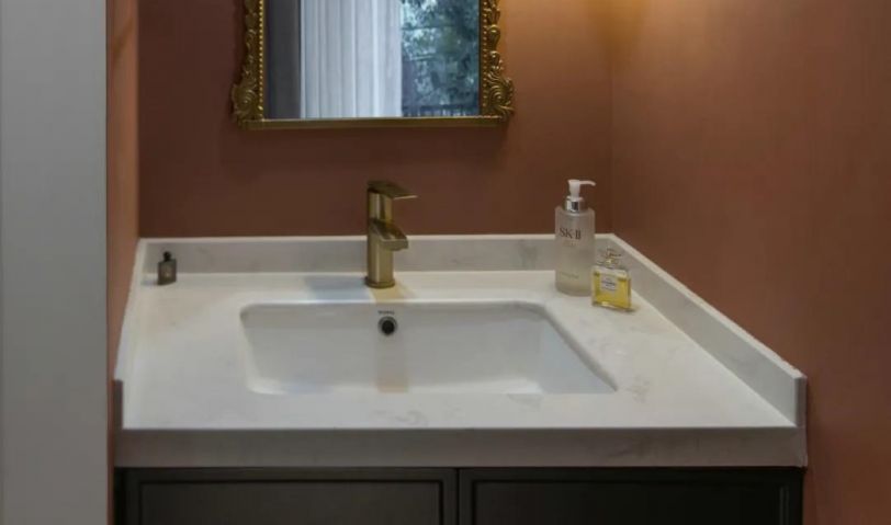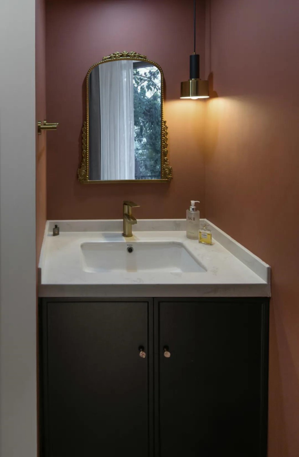 衛(wèi)生間的洗手盆設(shè)置在過道區(qū)域,粉紅色的墻面,黑色的定制櫥柜,還有復(fù)古范的金色框鏡子,也讓空間顯得更加實(shí)用成熟。