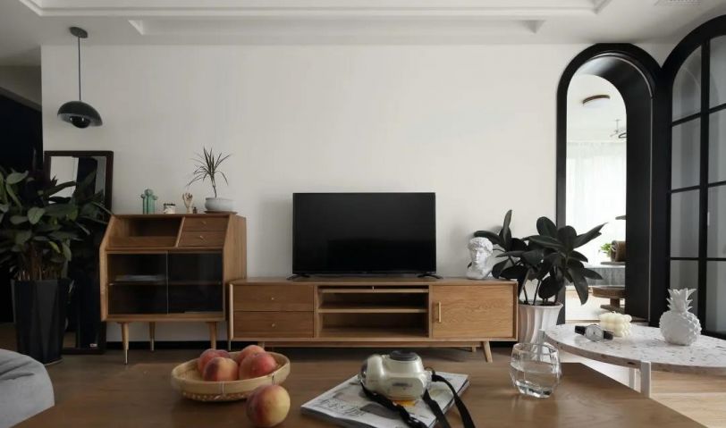 電視墻布置木質(zhì)電視柜與斗柜,布置綠植裝飾,右邊一扇黑色邊框的拱形門,簡(jiǎn)潔的空間下,營(yíng)造出一種小資清新