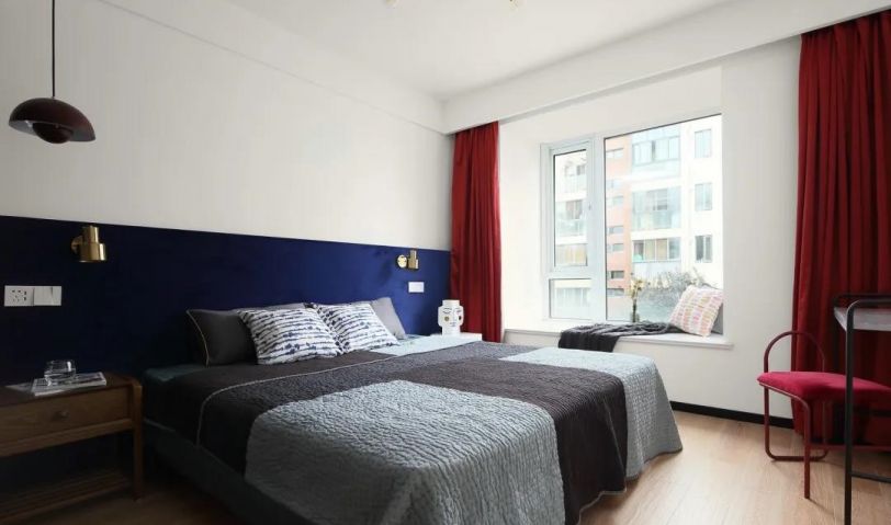 主人的床頭墻是深藍(lán)色的墻腳,搭配紅色的窗簾,結(jié)合簡(jiǎn)約舒適的床單,營(yíng)造出一種大膽的紅藍(lán)對(duì)比色空間感