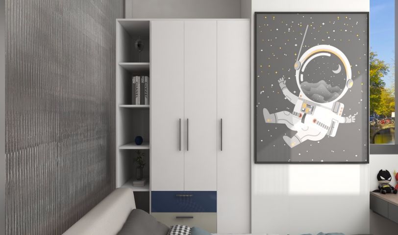 男孩房的轉(zhuǎn)角做內(nèi)嵌臺(tái)上衣柜保證收納同時(shí)可當(dāng)床頭柜