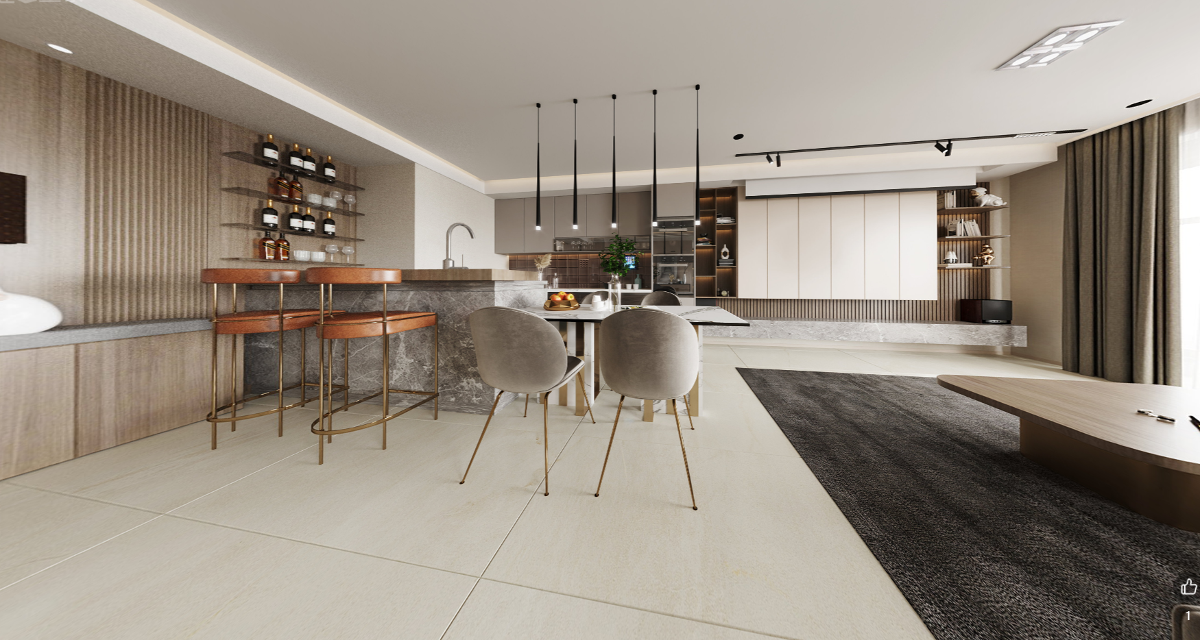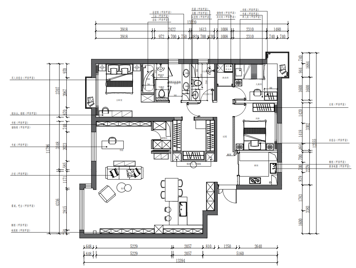 目前倆個人居住,將來考慮兒童房,對客廳需求很大,所以打通的客廳與臥室的墻,把客廳做大,及客廳,書房,西廚與一體的多功能起居室。