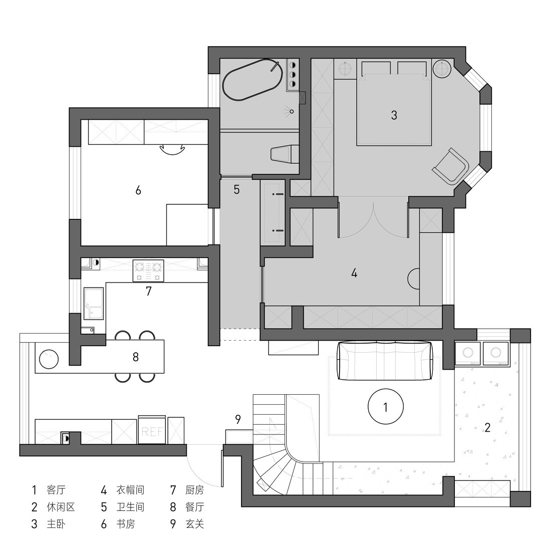 閱讀角與休息角,顛覆了空間的單一性,保留并發(fā)揮出陽光充足的優(yōu)勢。未做任何隔斷與形式上的分區(qū),簡單的一面柜子與一把沙發(fā)椅,就塑造了無限的可能性,希望居住者在此自由探索空間的意義