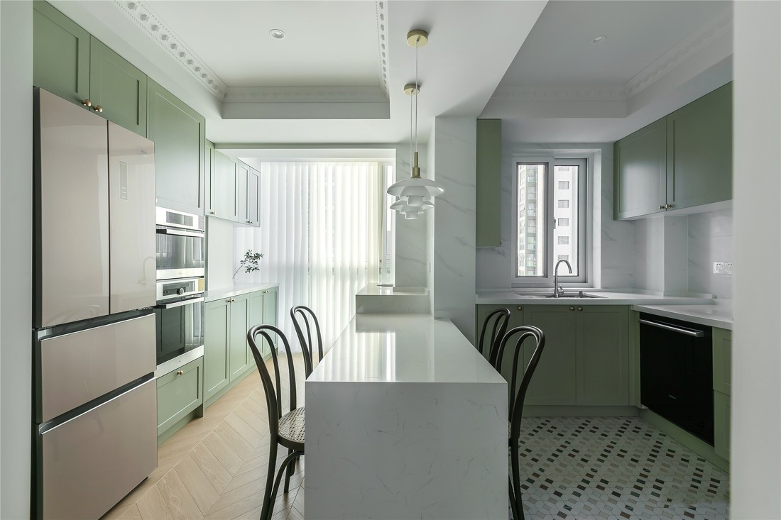 設(shè)計從傳統(tǒng)的廚房結(jié)構(gòu)里跳脫出來,將嵌入式家電與櫥柜結(jié)合