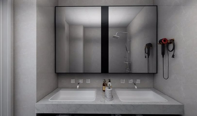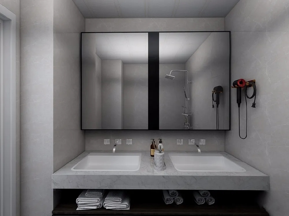 洗漱間在設(shè)計(jì)上滿足客戶的雙盆需求,離地式的浴室柜方便后期打掃衛(wèi)生。