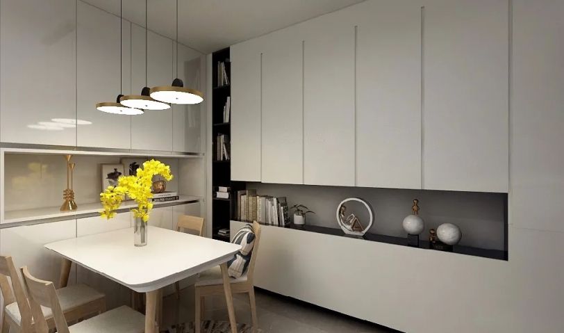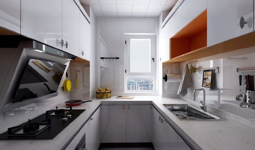 調(diào)整后的廚房可以滿足U型的櫥柜設(shè)計(jì),在功能和動(dòng)線上都得到了優(yōu)化,使用方便,整體的色調(diào)以白色明亮為主。