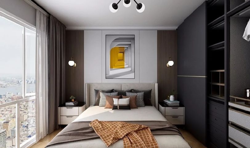 主臥的設(shè)計(jì)上采用對(duì)稱的是設(shè)計(jì),推拉式的衣柜方便日常的儲(chǔ)物。
