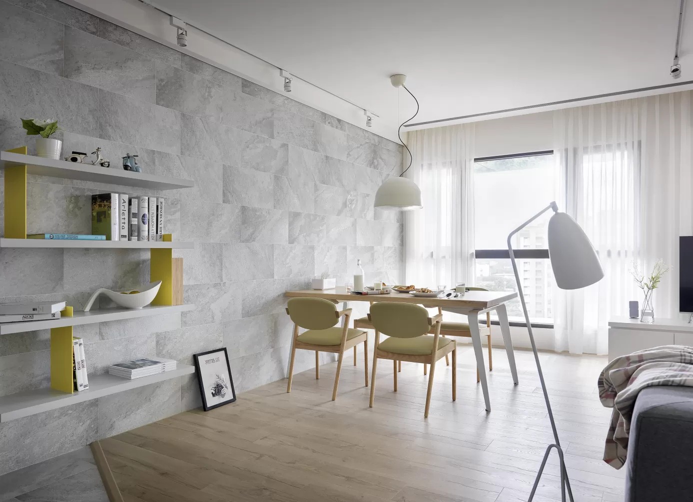 連貫的材質(zhì)規(guī)劃貫通這個(gè)空間中心,墨色紋理巖板電視背景墻作為主視覺延伸
