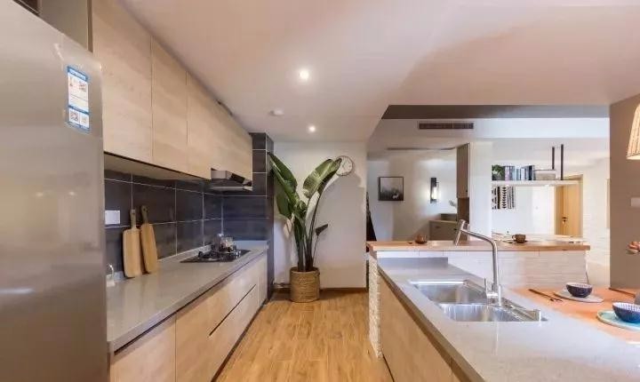 廚房地面通鋪地板磚,墻面鋪貼灰色金屬磚,雙排定制櫥柜擁有超強收納,將空間形成洗切炒黃金三角區(qū),使用合理。
