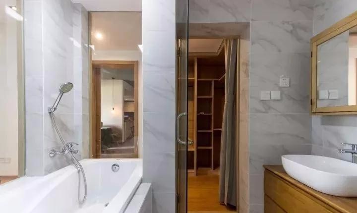 衛(wèi)生間墻面通鋪仿石紋瓷磚,設(shè)計浴缸部分玻璃墻面讓空間通透不壓抑,右邊實木臺盆柜,搭配IKEA的鏡柜,簡潔實用