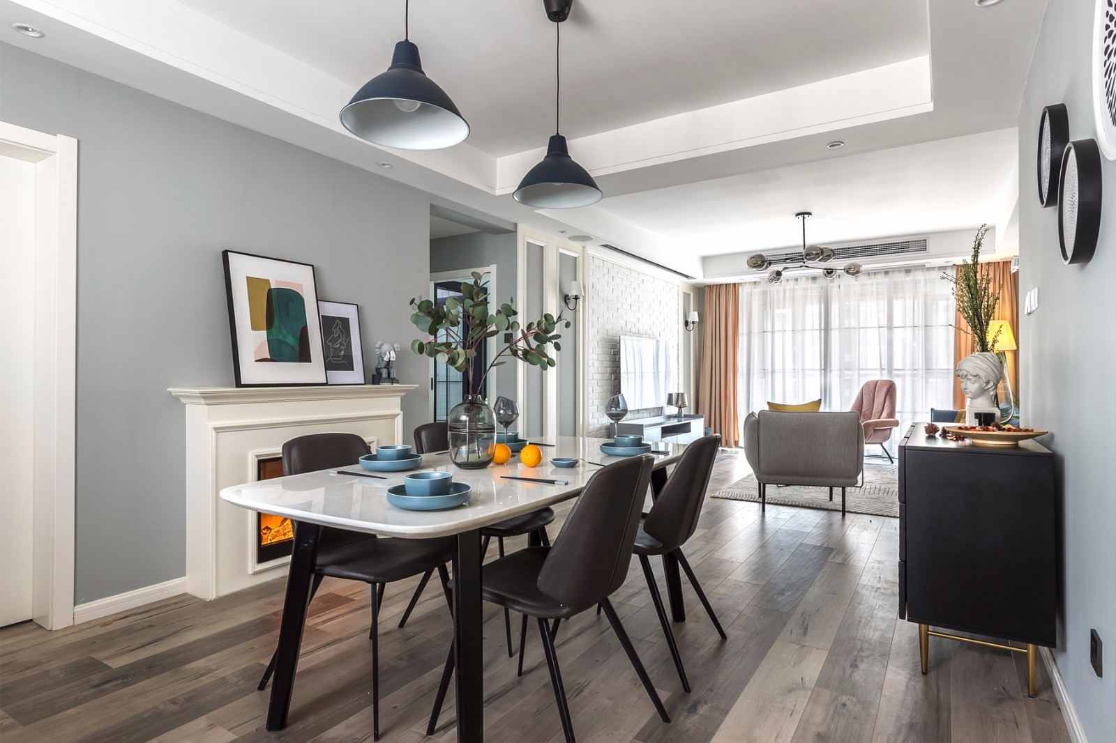 在客廳的設(shè)計上,設(shè)計師以內(nèi)斂的灰色調(diào)打底,塑造出一個靜謐安定的空間氛圍。透過對軟裝家居材質(zhì)的混搭,及初冬壁爐中的火焰緩緩的升起讓給生活帶來更多的儀式,使整個空間精致而不張揚,沉謐簡寧的氛圍