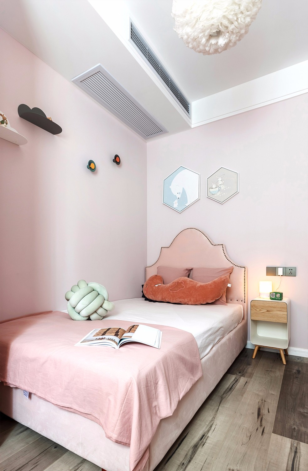 每個女孩都想著有一個粉嫩的空間,設(shè)計師采用了淡粉色的墻紙,結(jié)合一些兒童趣味的掛件裝飾,藍天 、白云、及精致的裝飾羽毛吊燈,使空間整體更加的趣味與溫馨