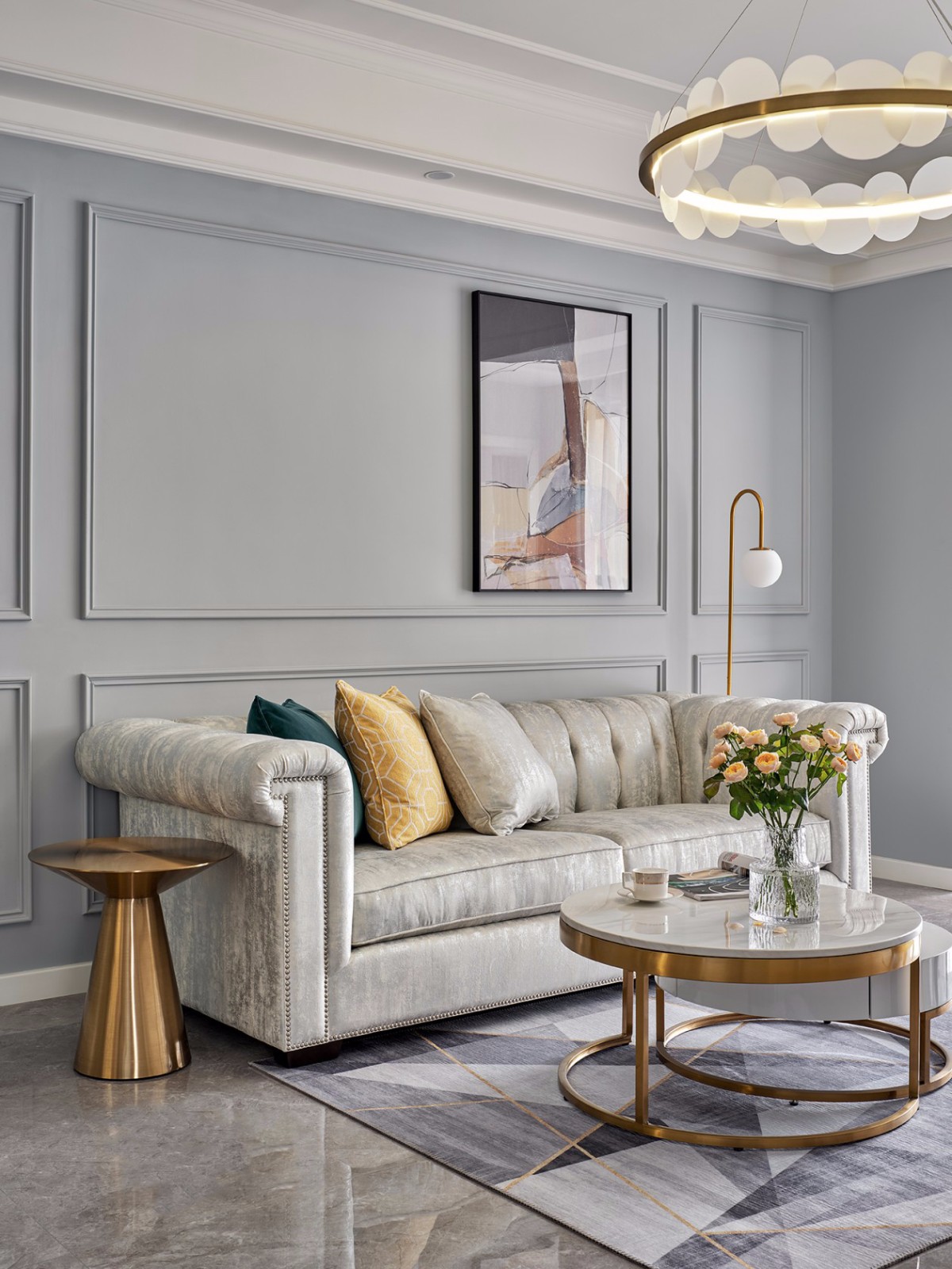 選用淺色系作為客廳的主色調(diào),融合金屬達(dá)到輕奢感。整體配色給人清新明亮的感覺,少許深色運用不顯壓抑反而更為吸睛。