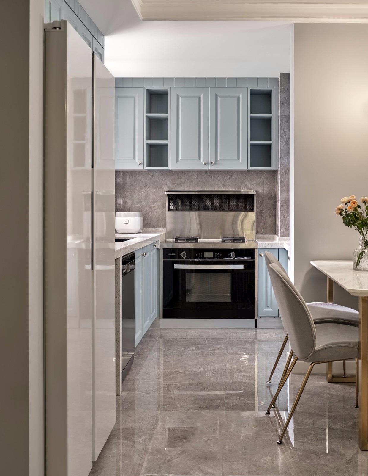 L型廚房操作臺面節(jié)約空間,大理石花紋地磚配上墻面線條造型讓空間更具層次,同時拉伸視覺效果。金屬燈具、餐椅的加入,讓空間更顯質(zhì)感。