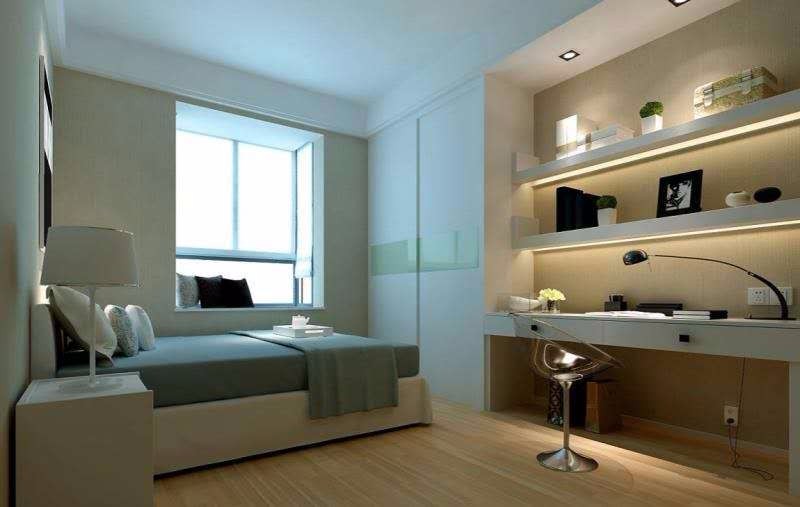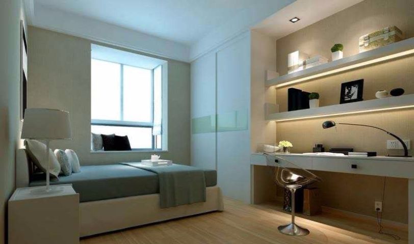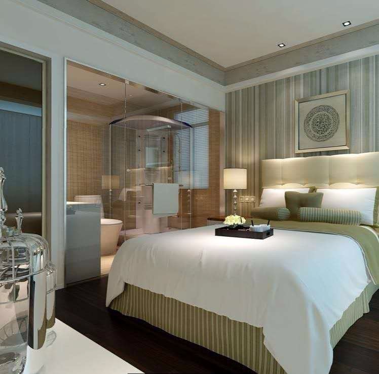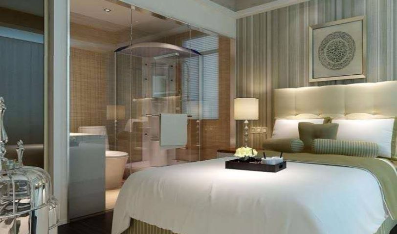 臥室與浴室相連接,采用鋼化玻璃隔斷