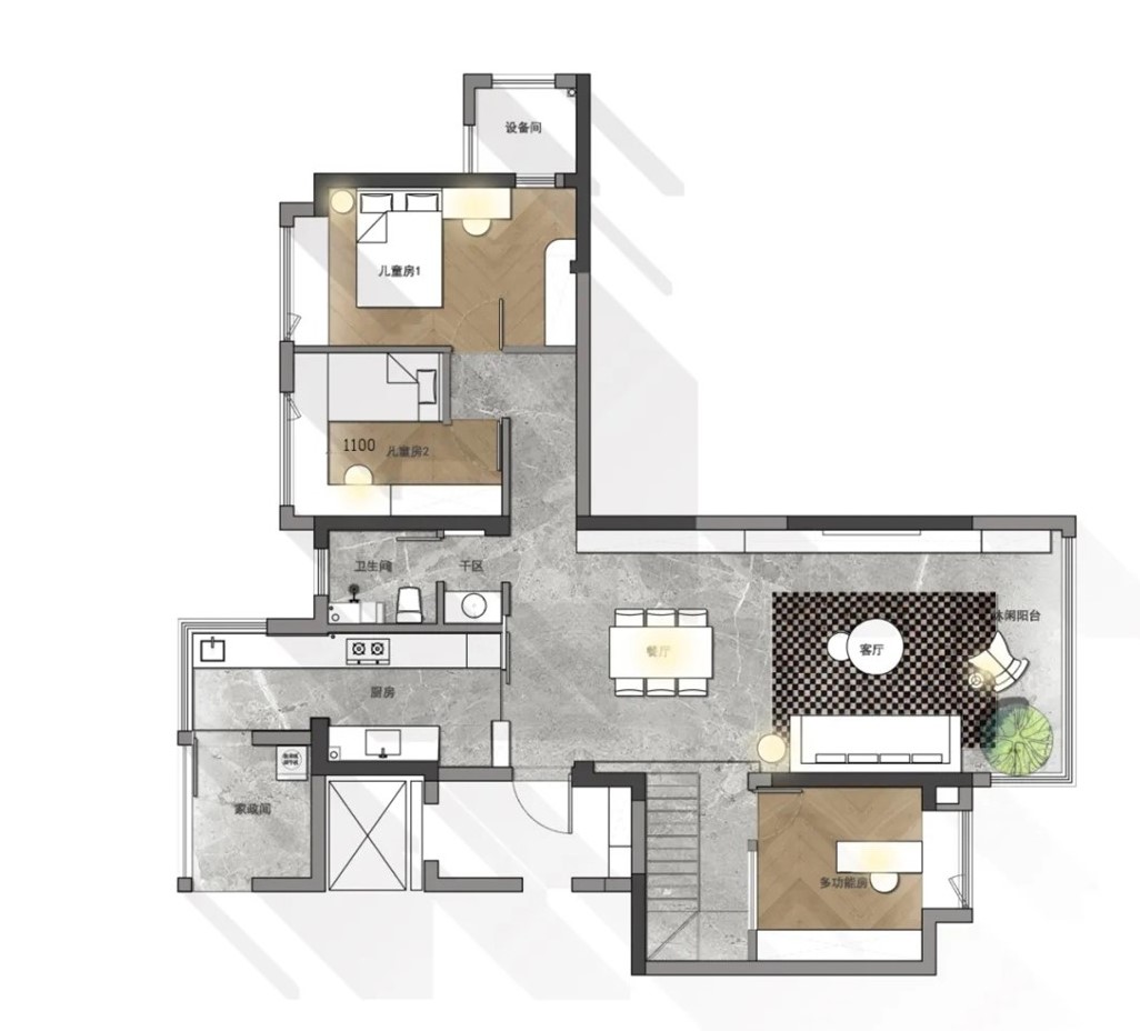 自由的空間尺度賦予生活更豐富的休閑之感,擴進陽臺后的客廳在光影中自由流淌,時間仿佛都在此放慢了腳步。 木質(zhì)的護墻、天然的大理石與藝術(shù)墻咔,讓自然質(zhì)樸的氣息充斥空間的每一個角落。在序列般的空間布局里,沙發(fā)與躺椅呈半圍合狀態(tài),帶來極度舒適與親近之感。