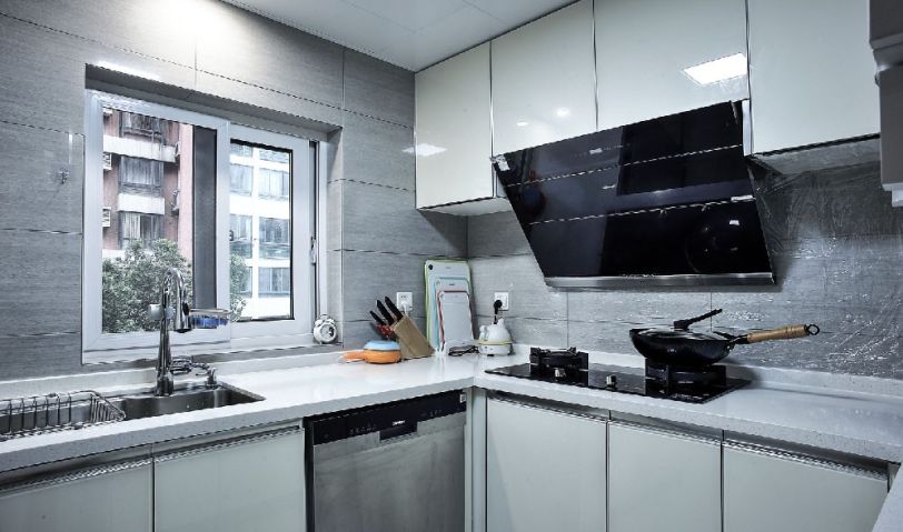廚房空間不大,通過設(shè)計(jì),該有都有,顏色搭配運(yùn)用淡色,敞亮干凈整潔。