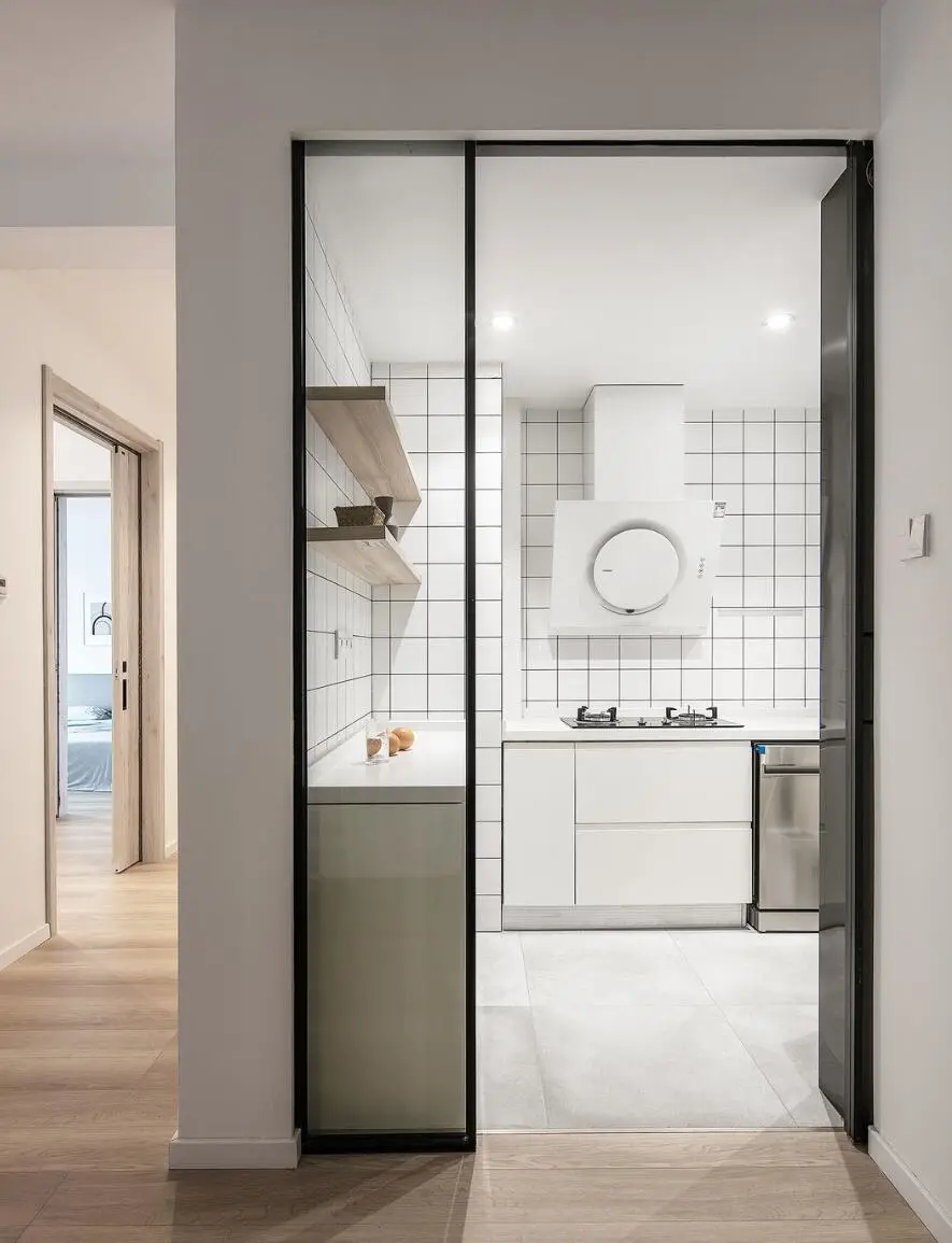 廚房以白色為主色調(diào),采光充足,功能性強。巧妙設(shè)計移門,門洞可完全打開,增加空間的通透感。